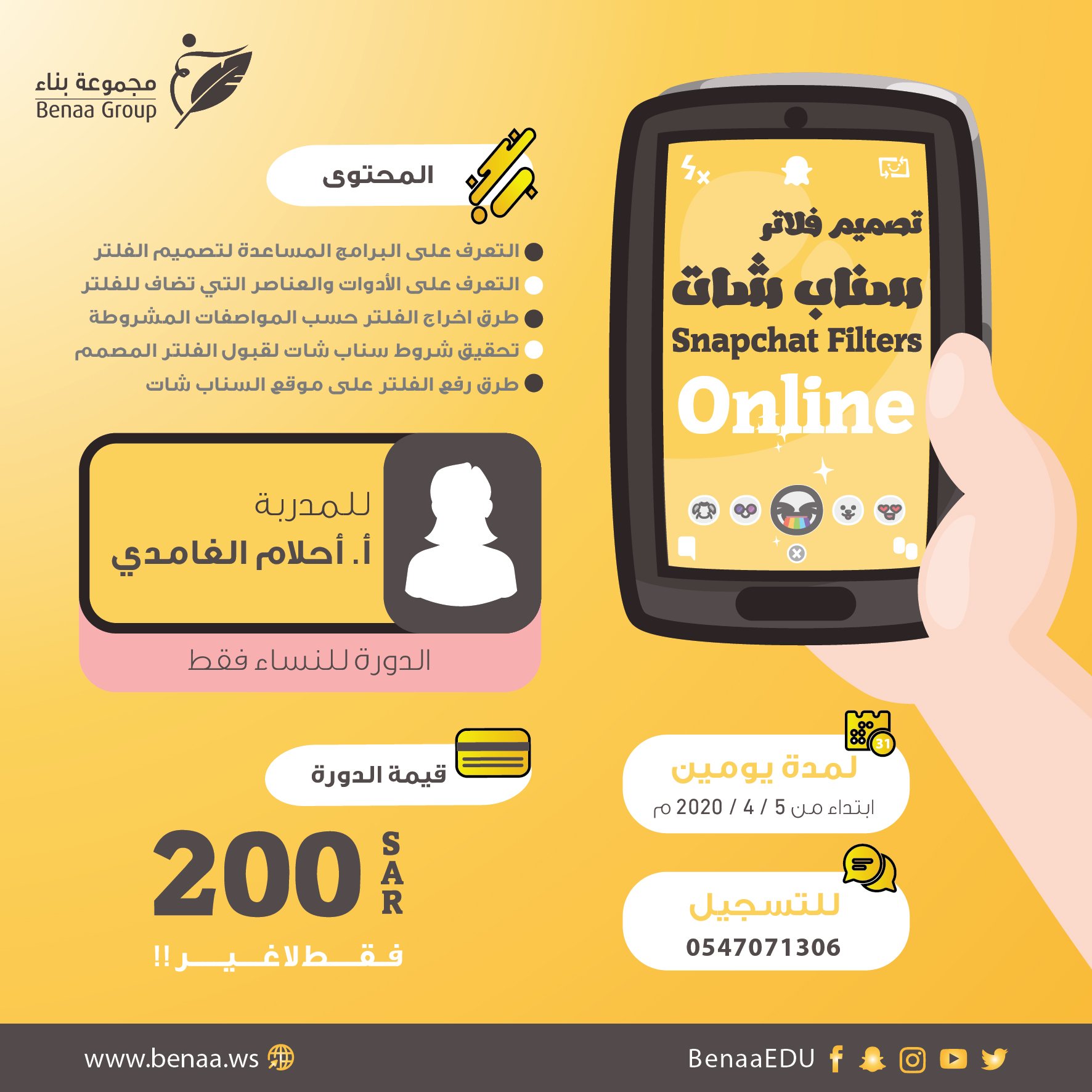 مجموعة بناء no twitter ودك تصممين فلتر لمناسبتك على السناب جبنالك دورة تصميم لحد بيتك كوني معنا أون لاين في دورة تصميم فلاتر سناب شات للأستاذة أحلام الغامدي انضمي